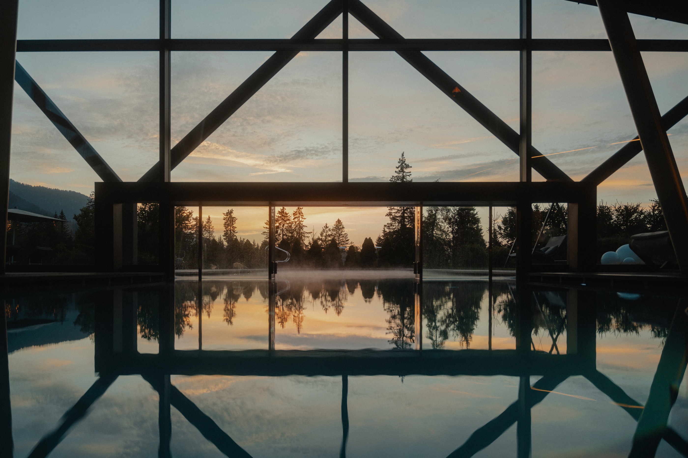 Unser mit dem bsw-Award ausgezeichneter Indoor-Outdoor-Pool lädt mit 31°C warmem Wasser zum Schweben ein. Die Berge haben Sie dabei stets im Blick.