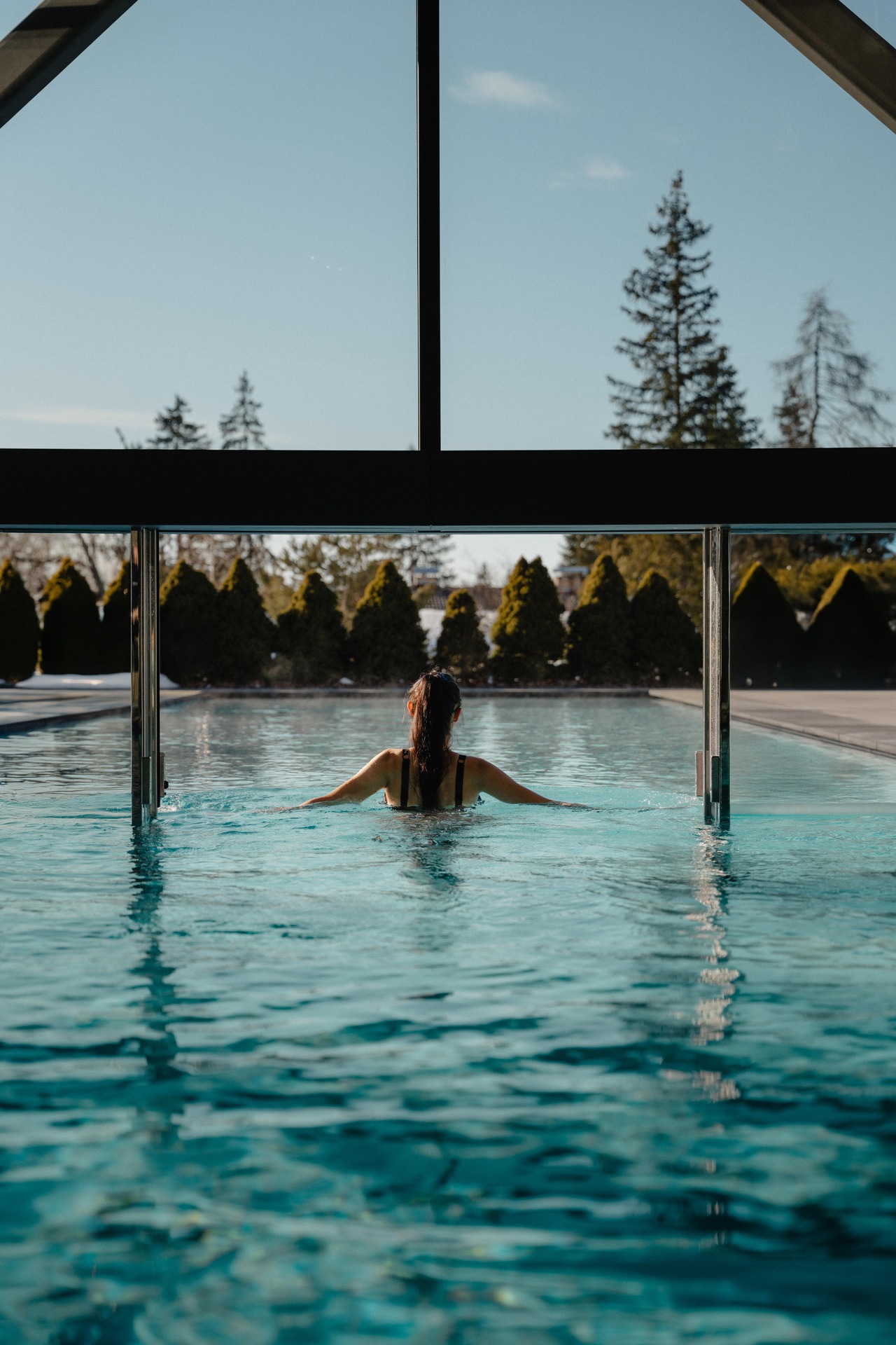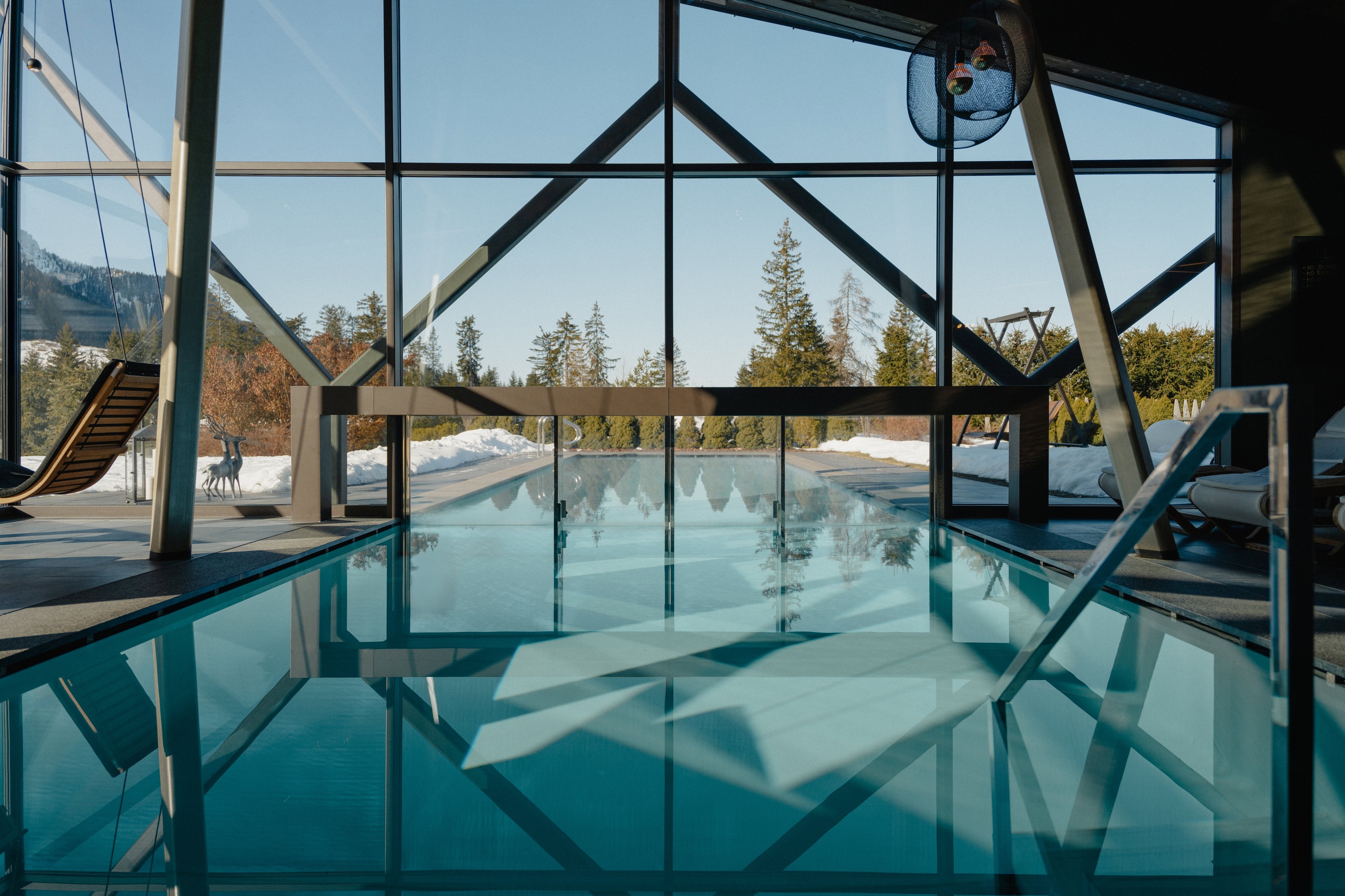 Our bsw-Award winning indoor-outdoor pool invites you to float in 31°C warm water. The mountains remain in sight throughout your relaxation.